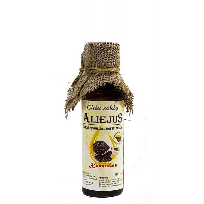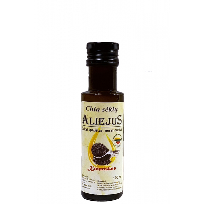 Chia sėklų aliejus (100 proc. natūralus, šalto spaudimo, nerafinuotas, stiklo buteliuke) 100ml. Natūralus, kaimiškas, naminis čija(Chia) sėklų aliejus puikiai tiks Jūsų patiekalams pagardinti bei odos procedūroms.