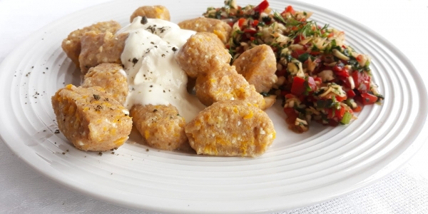 Nepaprastai skanus patiekalas - moliūginiai varškės virtinukai su salotomis: