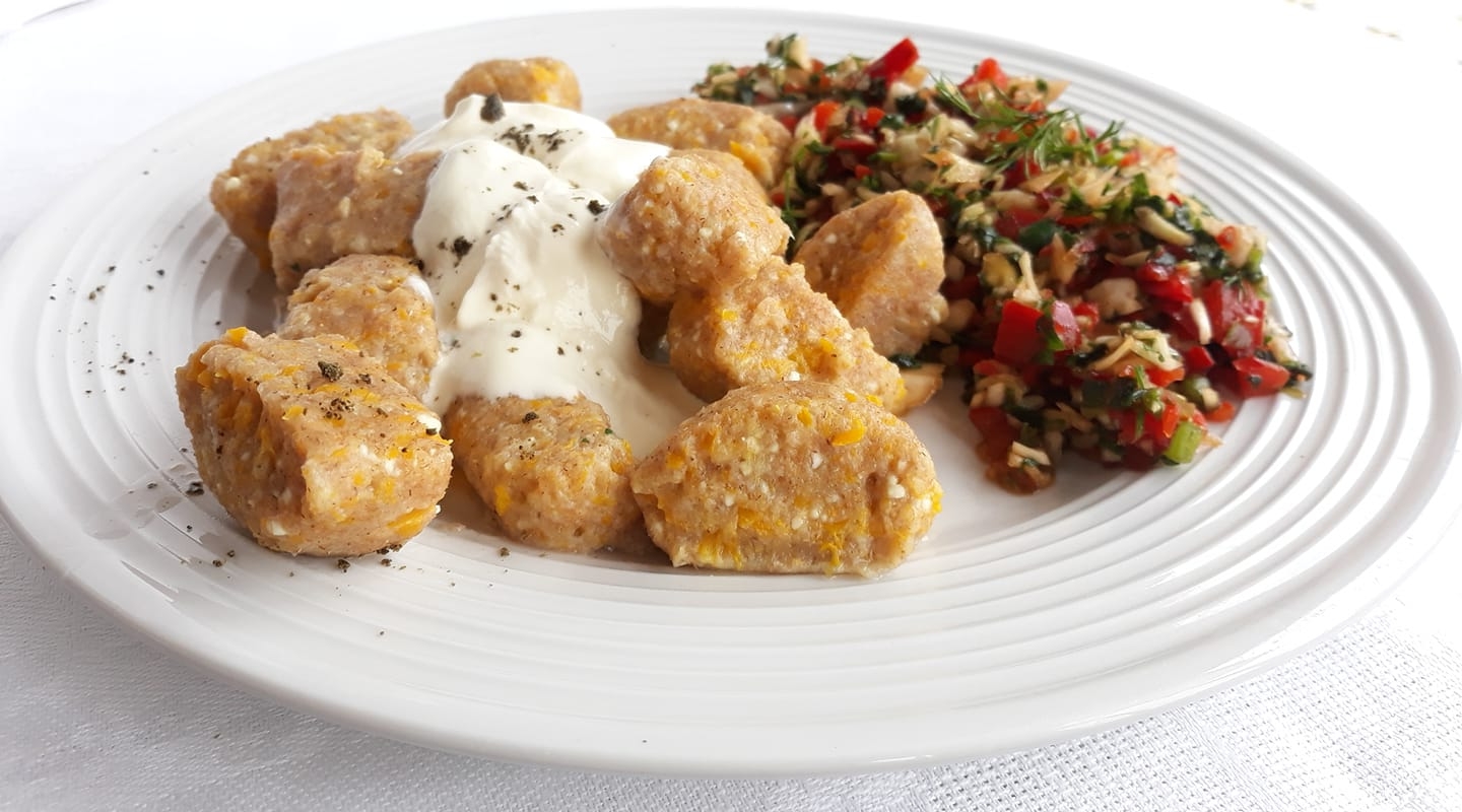 Pamažu maišant suberti miltus ir užminkyti tešlą. Ji formuojama rankomis, gaunasi vos lipni. Iš jos formuojamas pailgas ritinukas. Jis supjaustomas gabaliukais po 2- 3 cm.;