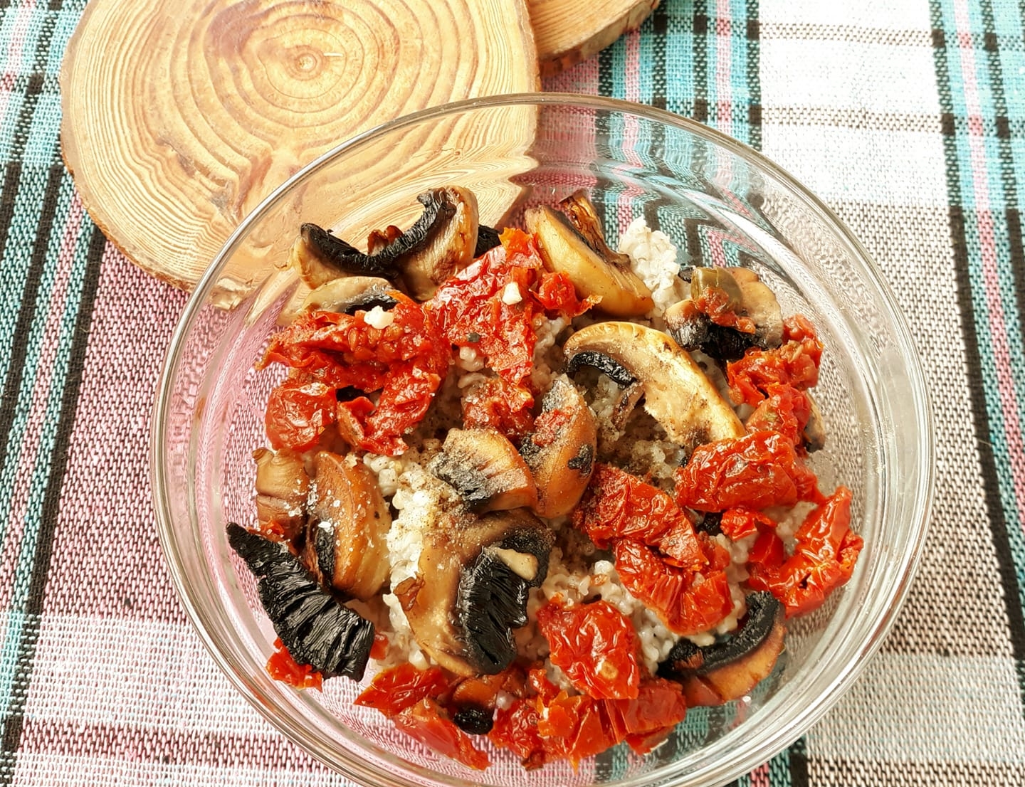 Pagaminimo eiga: Miežines arba bet kokias kitas kruopas užvirti, 15 minučių virti ir dar kelias minutes pabrinkinti. Pakepinti pievagrybius, saulėje džiovintus pomidorus ir visą turinį sumaišyti su pasirinkta koše. Viską paskaninti lazdyno riešutų aliejumi bei lukštentomis kanapių sėklomis;