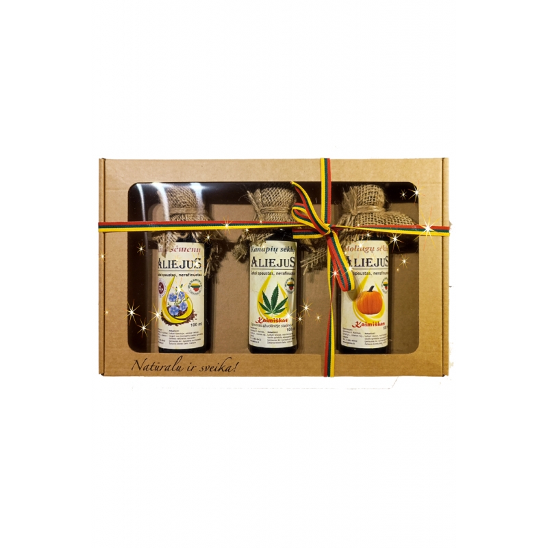 Rinkinį sudaro: senoviniu būdu spaustas kanapių sėklų, moliūgų sėklų bei linų sėmenų aliejus(po100ml). Supakuotas gražioje kartono dovanų dėžutėje. Aliejų spaudžiame unikaliu senoviniu būdu , todėl jo skonis yra ypatingai natūralus, išraiškingas ir gurmaniškas.